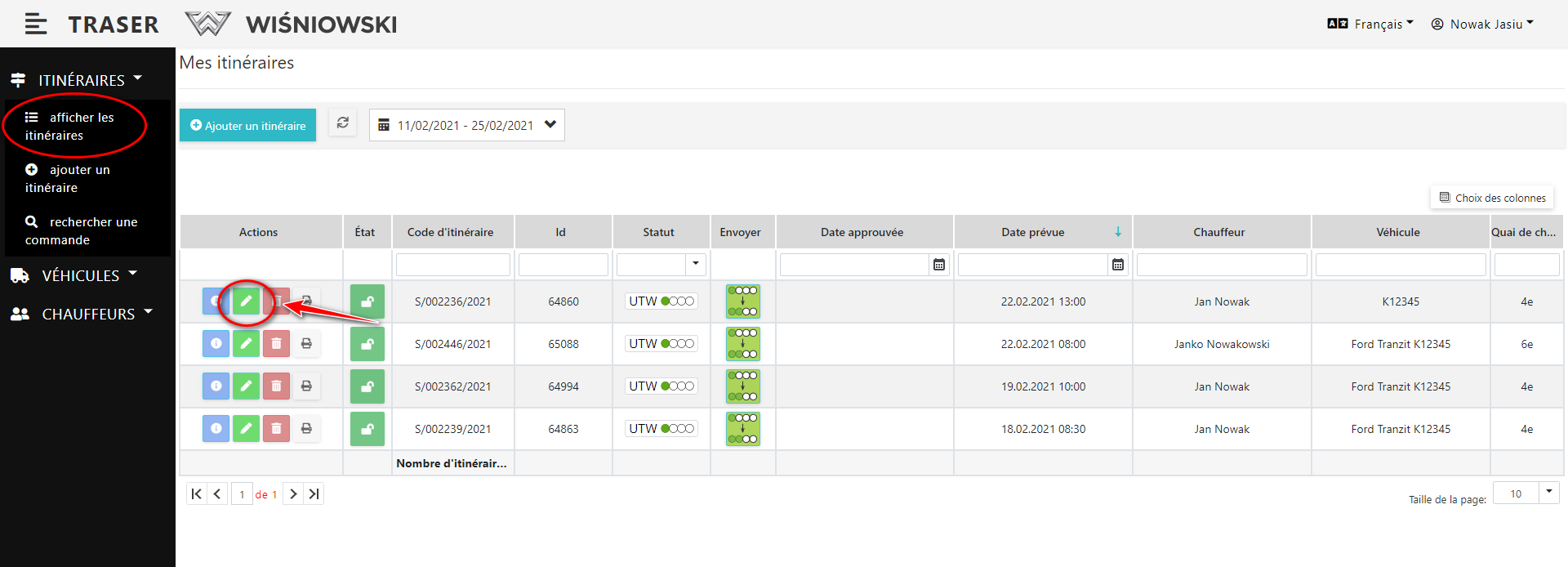 Cliquez sur le bouton vert avec l'icône du crayon, à côté de l'itinéraire approprié. (Fig. 1.).