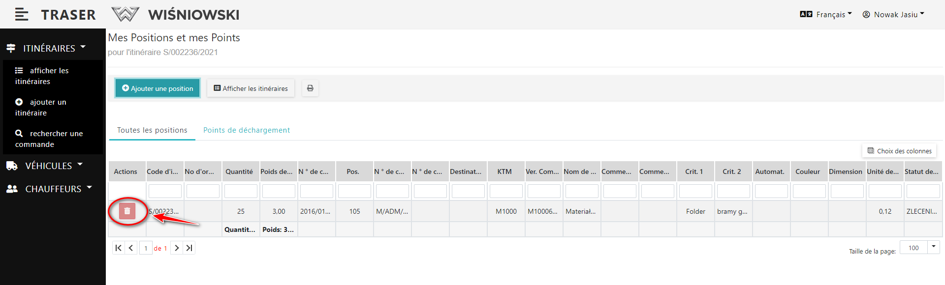 1. Allez à Détails de l'itinéraire (Fig. 1.) et cliquez sur le bouton rouge avec l'icône de la poubelle à côté de l'élément sélectionné (Fig. 4.). Confirmez ensuite en cliquant sur le bouton "SUPPRIMER".