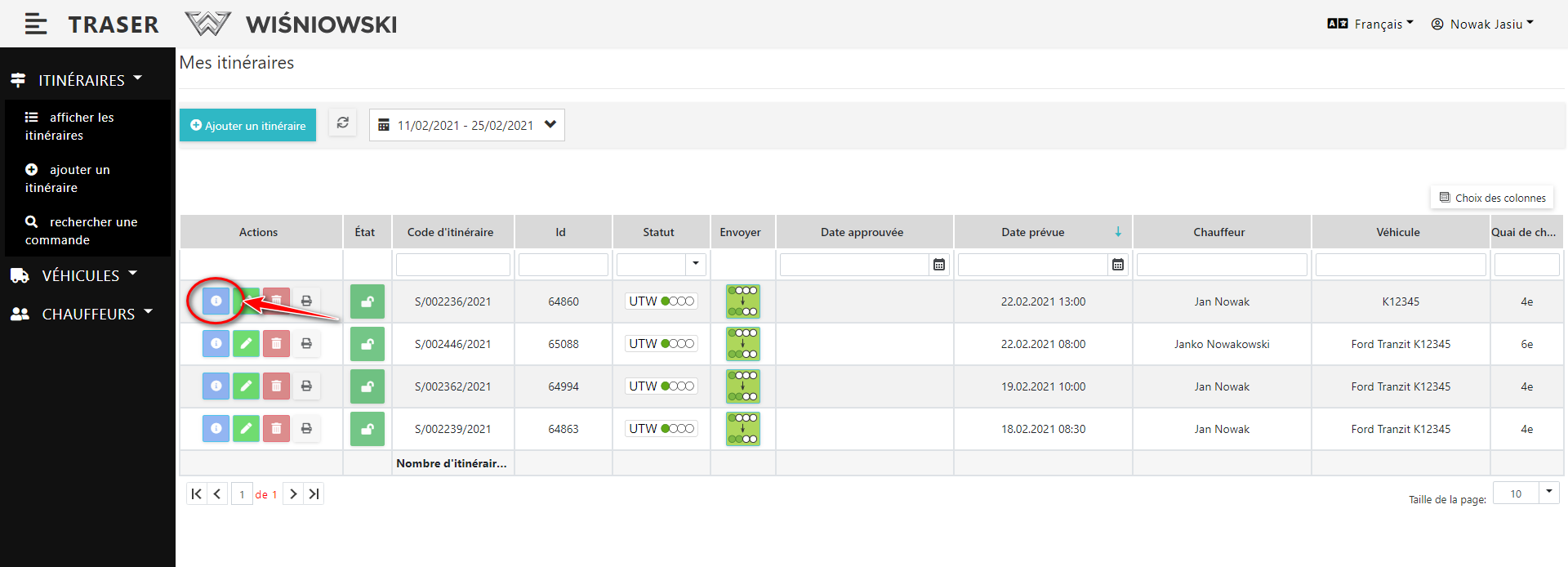 1. Sélectionnez dans le menu latéral: Itinéraires→ afficher les itinéraires. La liste des itinéraires doit apparaître. Cliquez sur le bouton bleu avec l'icône d'information, à côté de l'itinéraire approprié (Fig. 1.).