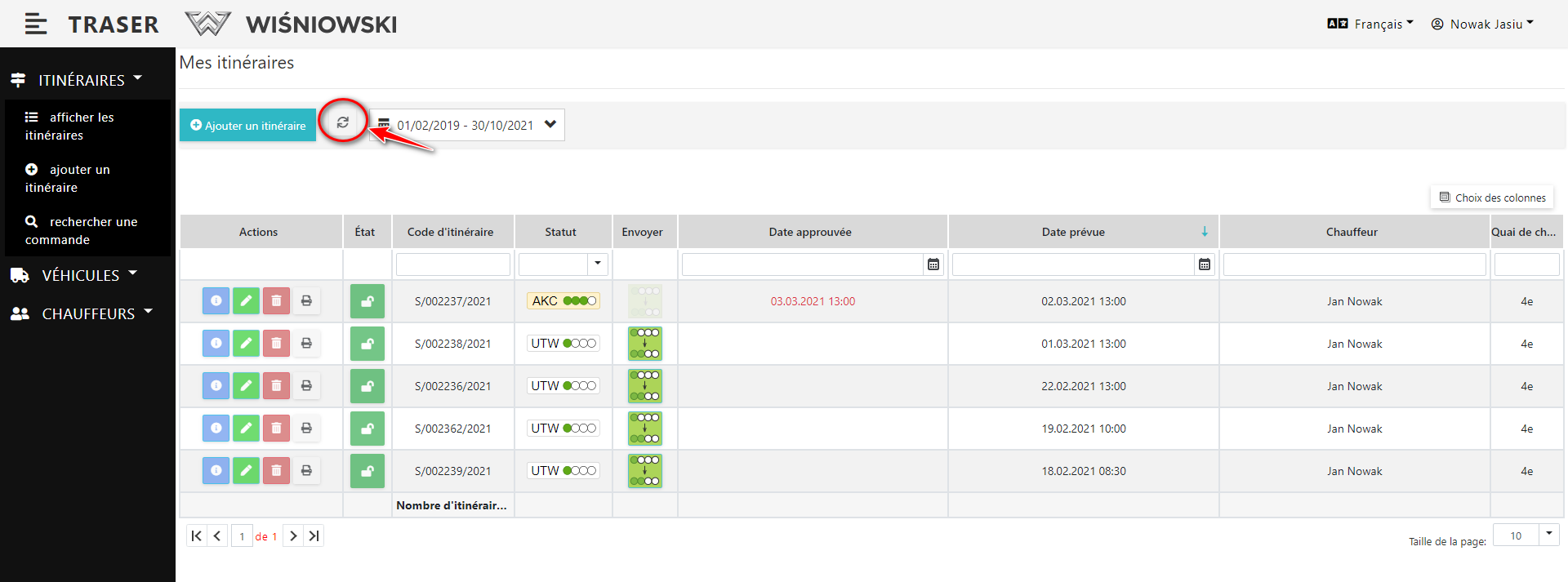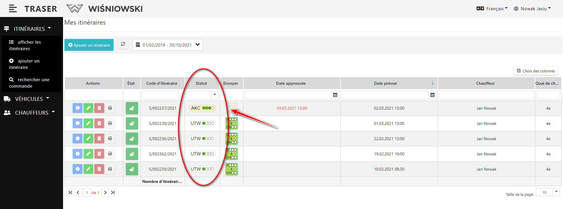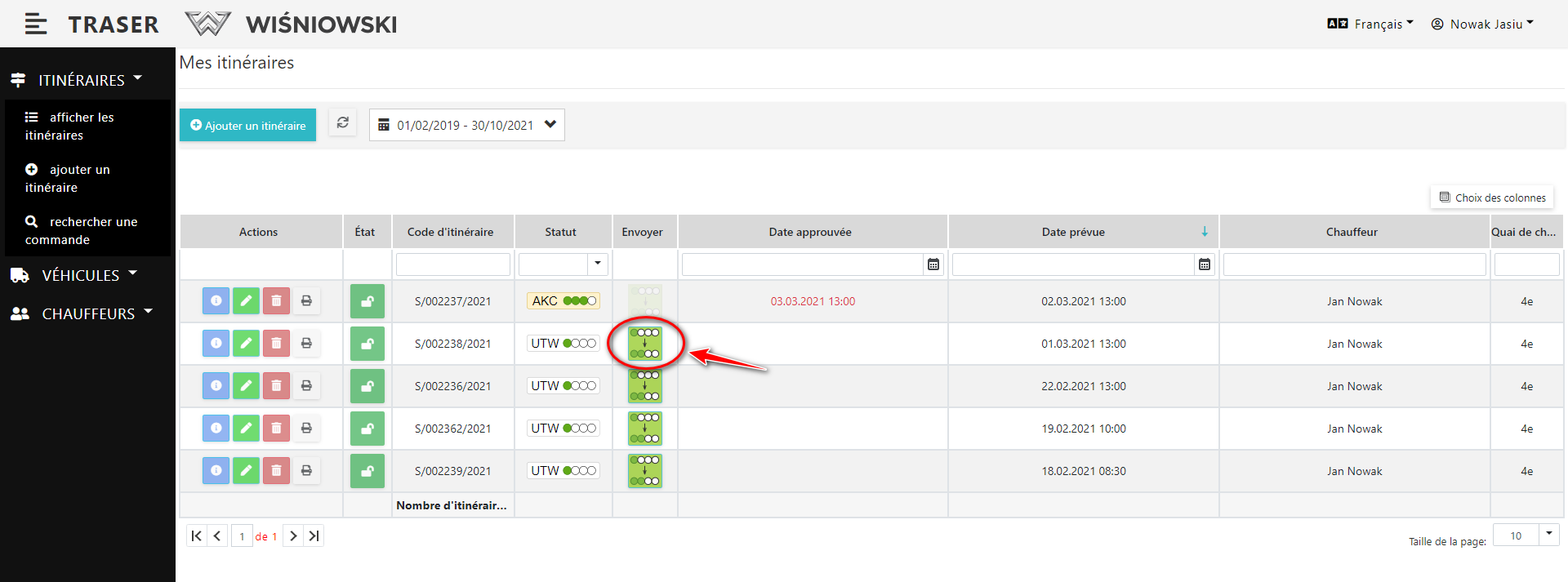 Pour passer du statut UTW au statut WER cliquez sur le bouton vert dans la colonne "Envoyer". (Fig. 3.). Seuls les itinéraires ayant le statut UTW ont ce bouton actif.