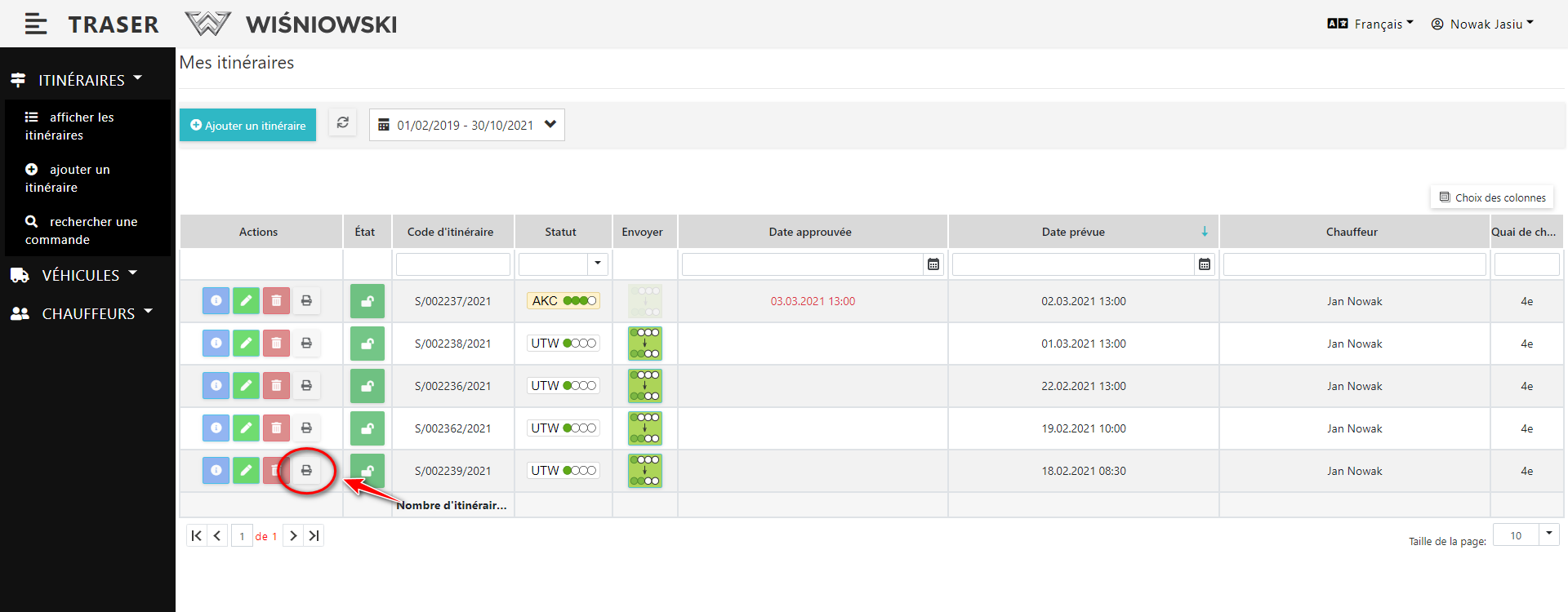 1. Cliquez sur le bouton gris avec l'icône de l'imprimante à côté de l'itinéraire sélectionné (Fig. 5).