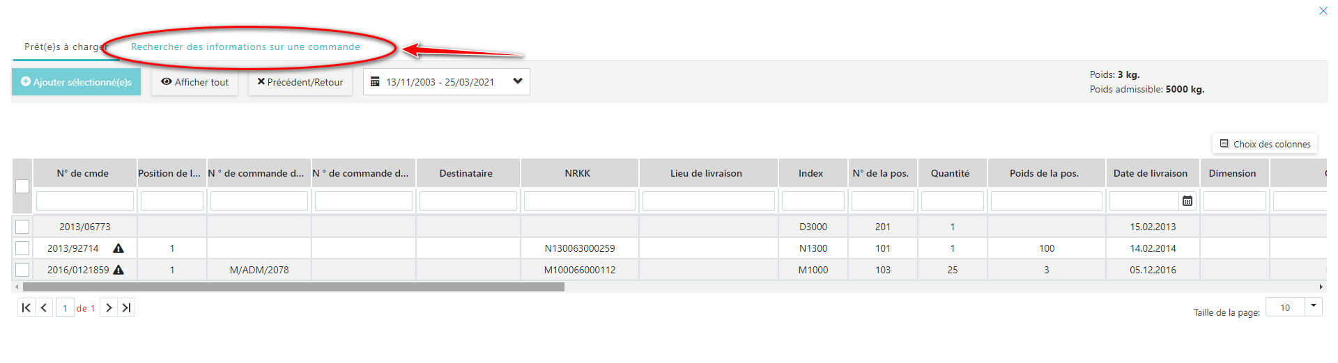 Si vous avez saisi le bon numéro de commande, la liste des positions sera affichée.