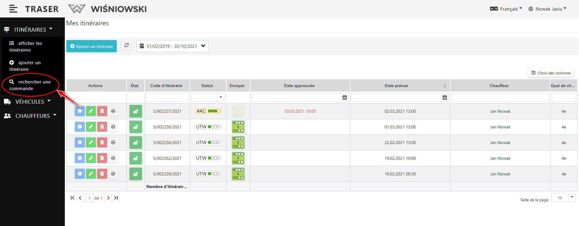 1. Sélectionnez dans le menu latéral : Itinéraires → rechercher une commande (Fig.1.).