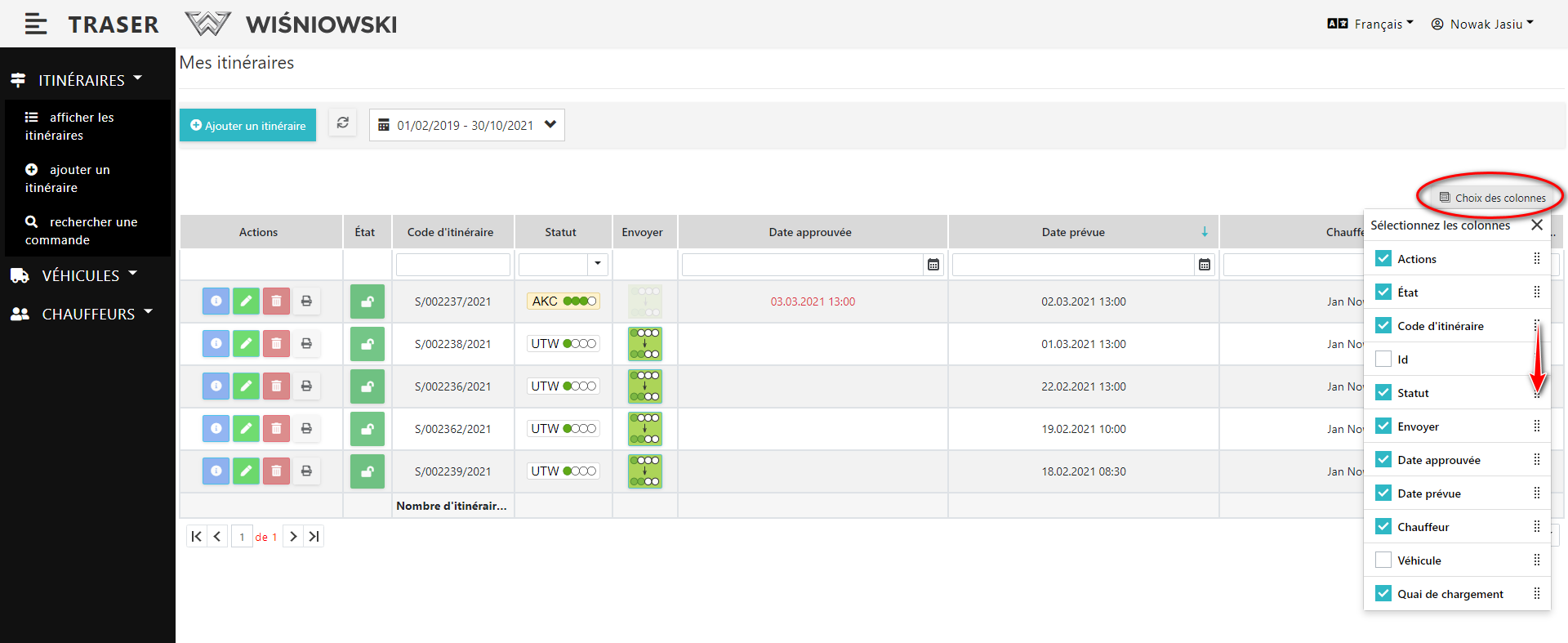 1. Affichez n'importe quel tableau. Cliquez sur le bouton "CHOIX DES COLONNES", déplacez ensuite la colonne choisie avec la souris à la position préférée.