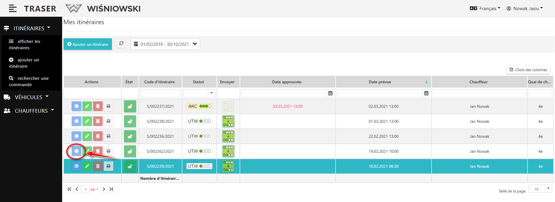 1. Sélectionnez dans le menu latéral: Itinéraires → afficher les itinéraires. La liste des itinéraires doit apparaître. Cliquez sur le bouton bleu avec l'icône d'information, à côté de l'itinéraire approprié (Fig. 1.).