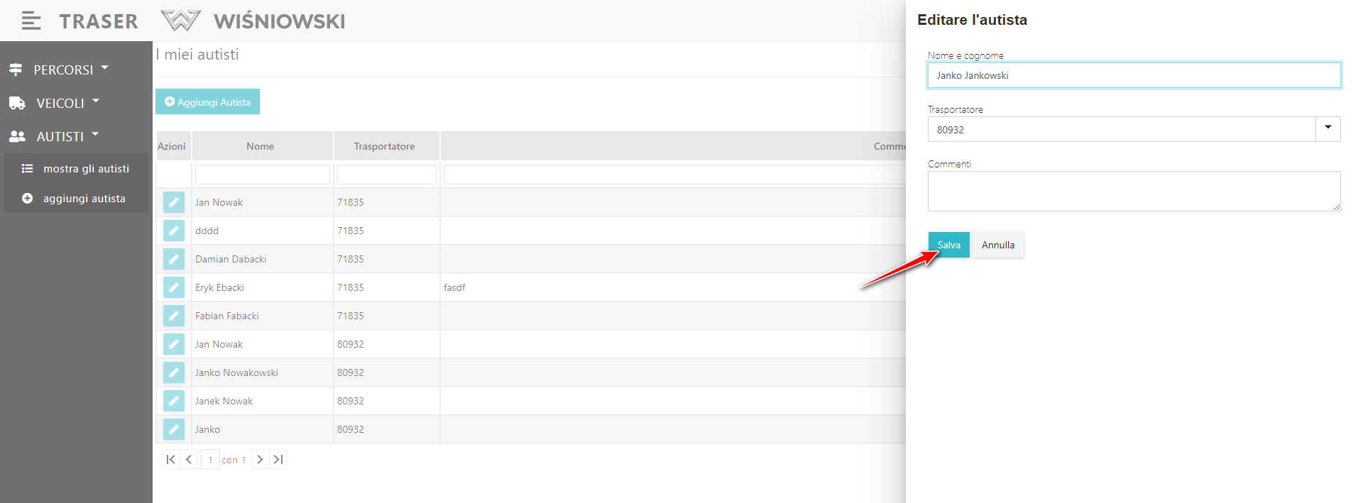3. Apportare la modifica all'Autista, sul pannello laterale e clicca sul tasto " SALVA " (Dis. 7.).