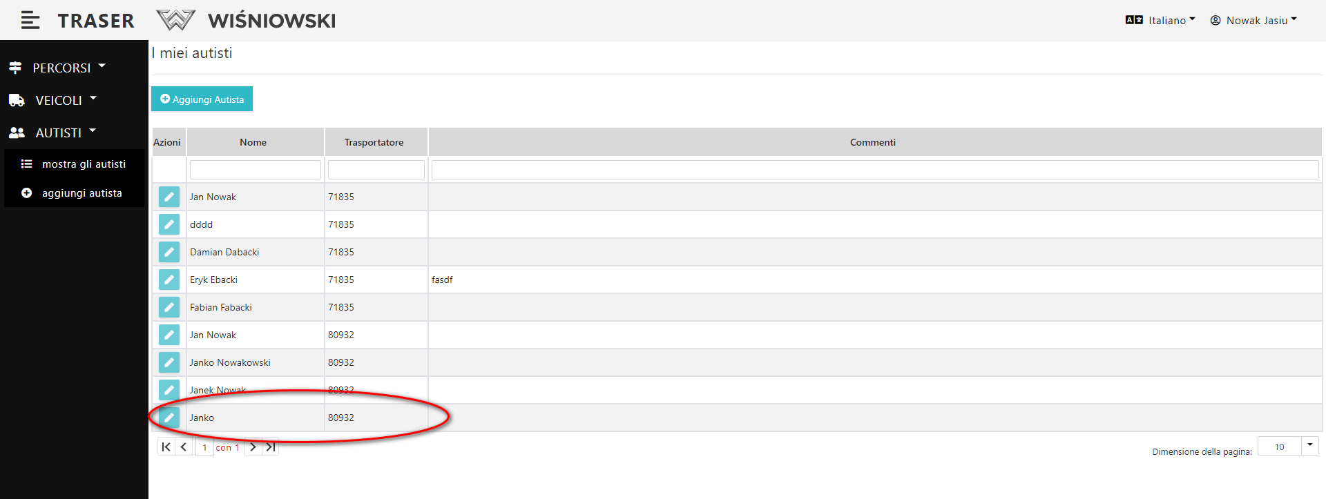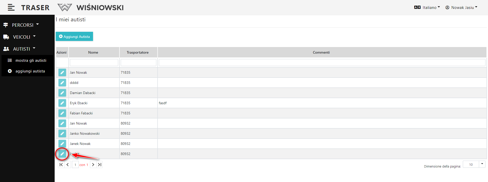 2. Clicca sul tasto verde con l'icona della matita, accanto all'Autista selezionato (Dis. 6.), per aprire il pannello laterale di modifica dell'Autista.