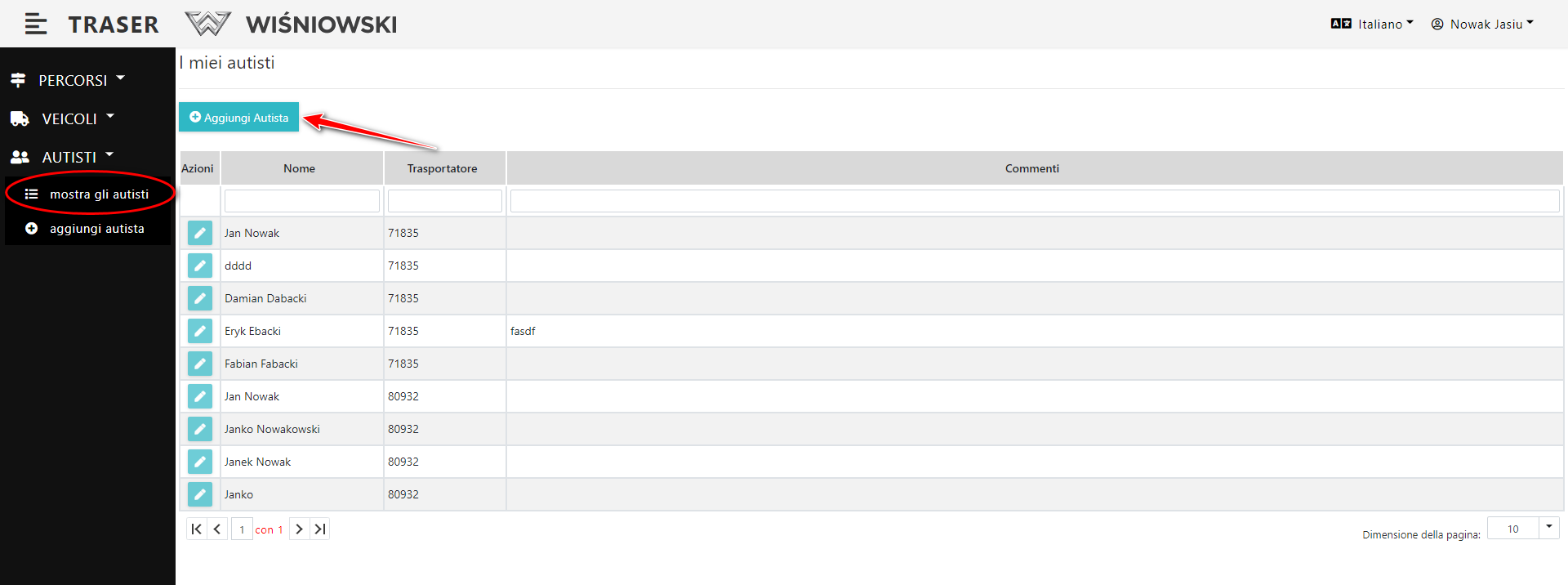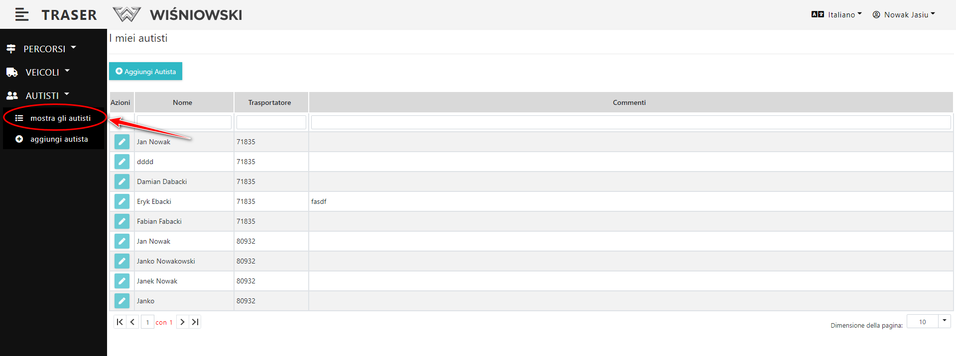 1. Seleziona dal Menu laterale: Autisti → mostra. (Dis. 5.). Dovrebbe apparire una lista di Autisti.