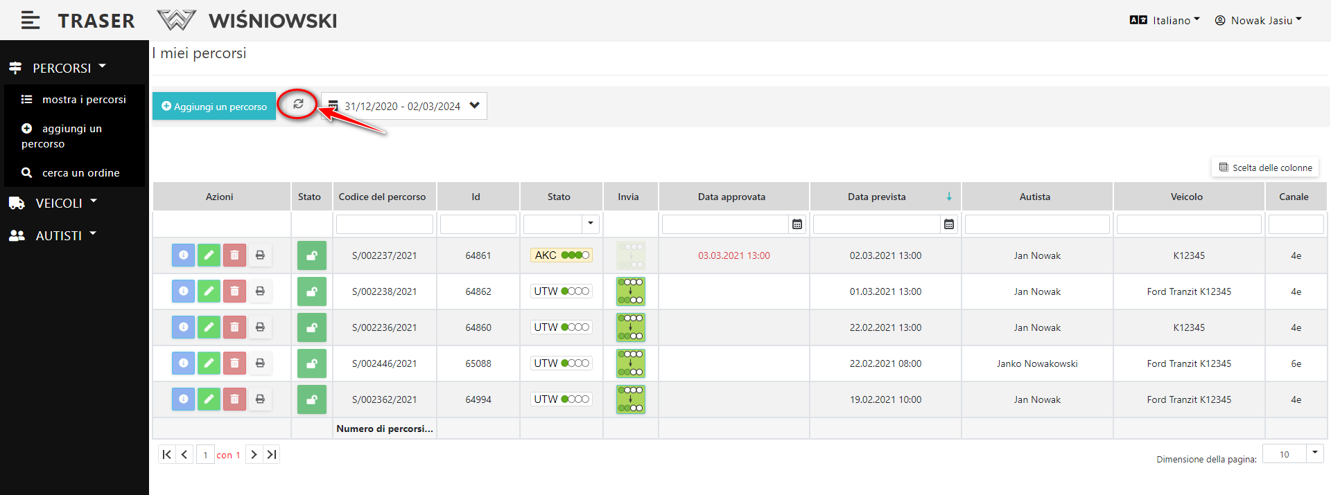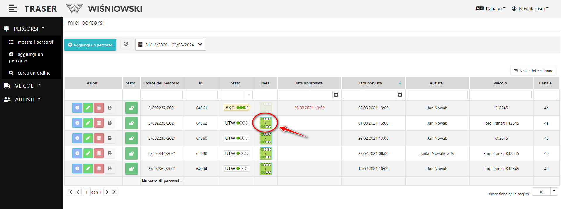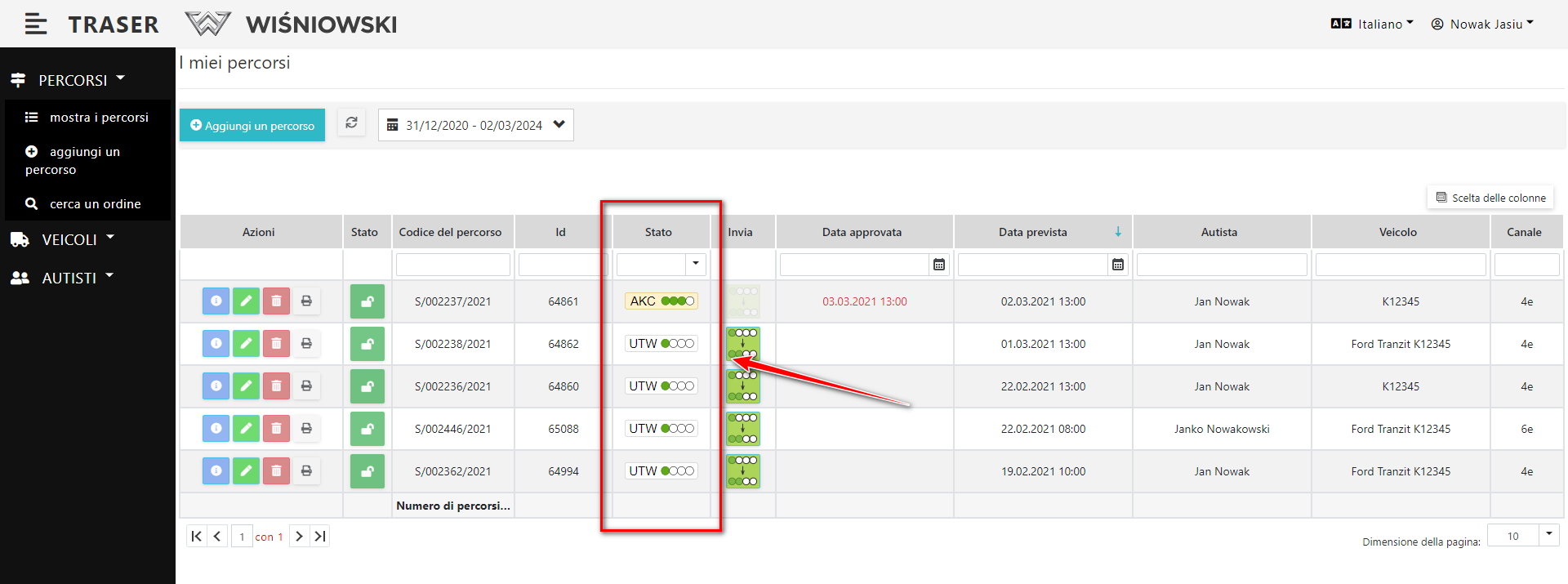 Per passare dallo stato UTW allo stato WER clicca sul tasto verde nella colonna "Invia" (Dis. 3.). Solo i Percorsi con stato UTW, hanno questo tasto attivo.