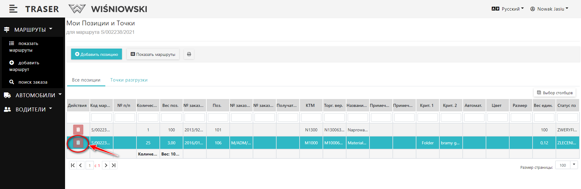 1. Войдите в подробности Маршрута (Рис. 1.) и нажмите красную кнопку со значком корзины рядом с выбранной Позицией (Рис. 4.). Затем подтвердите, нажав кнопку «УДАЛИТЬ».