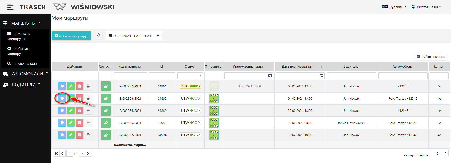 1. Выберите в боковом меню: Маршруты → показать маршруты. Должен появиться список маршрутов. Нажмите синюю кнопку со значком информации рядом с соответствующим маршрутом (Рис. 1.).