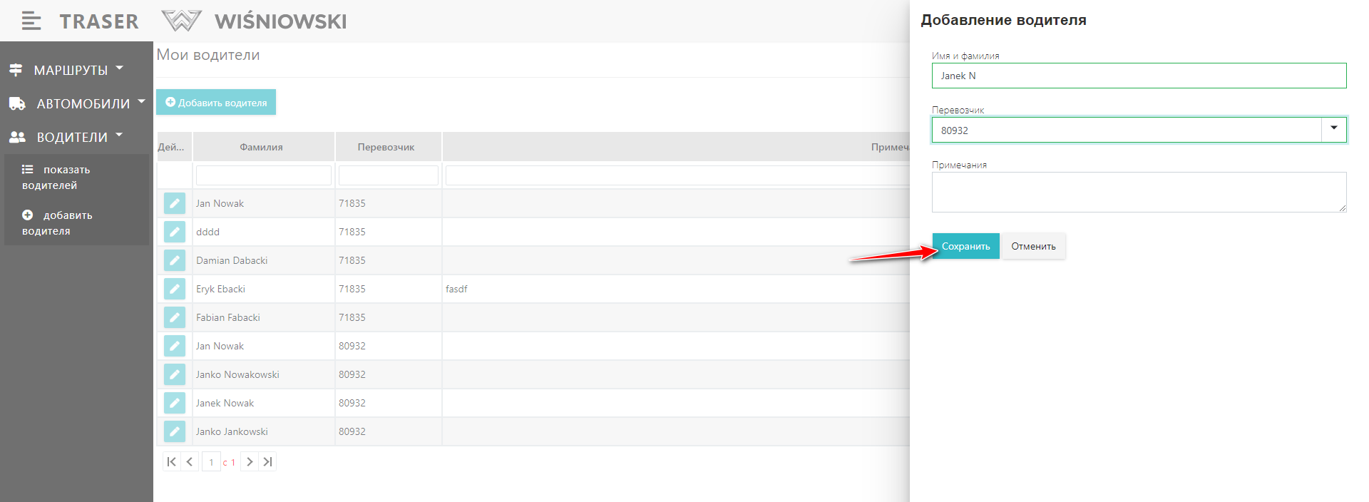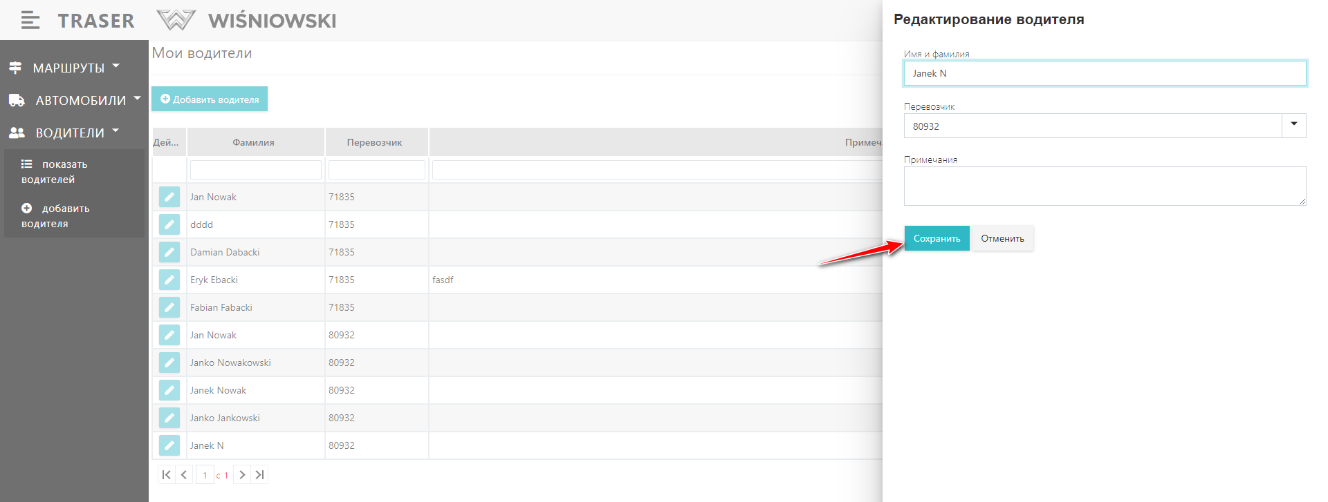 3. Отредактируйте Водителя на боковой панели и нажмите кнопку «СОХРАНИТЬ» (Рис. 7.).