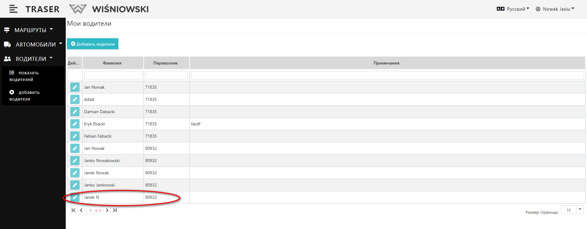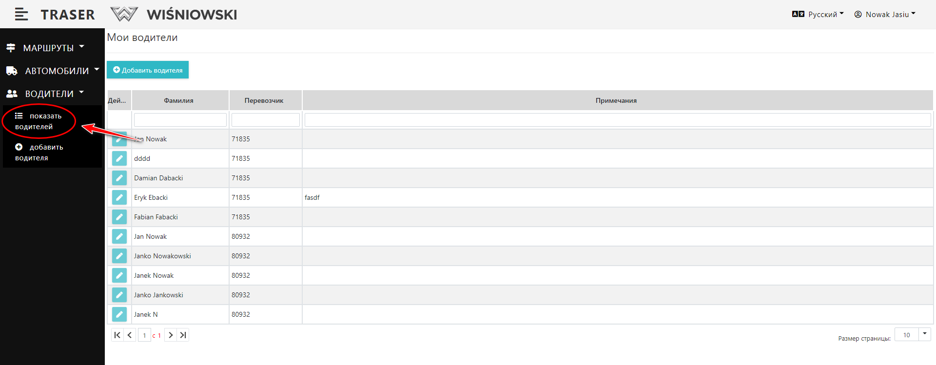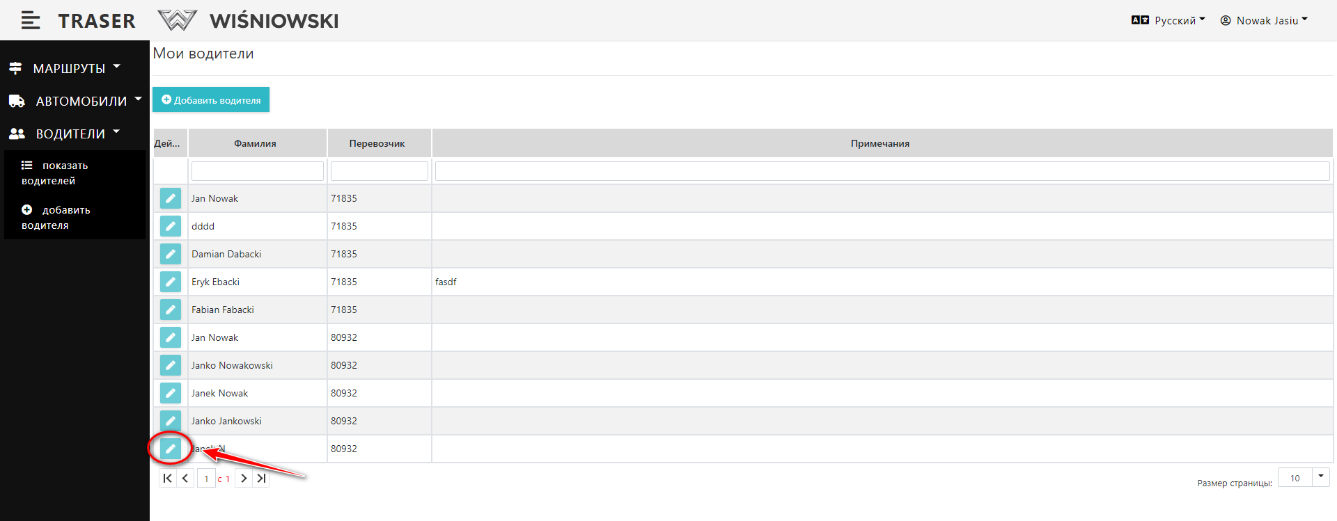 2. Нажмите зеленую кнопку со значком карандаша рядом с соответствующим Водителем (Рис. 6.), чтобы открыть боковую панель для редактирования Водителя.