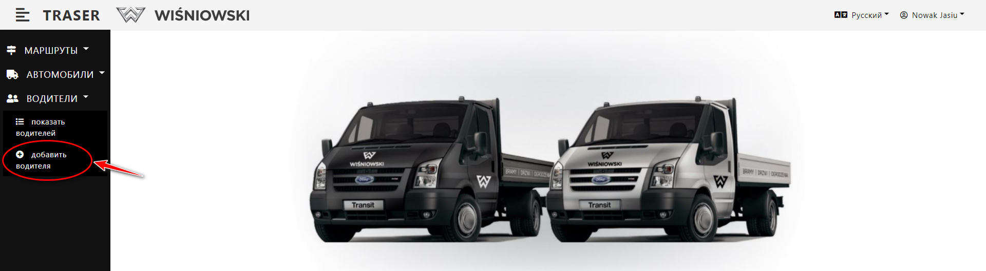 Рис. 1. Добавление водителя с помощью бокового меню.