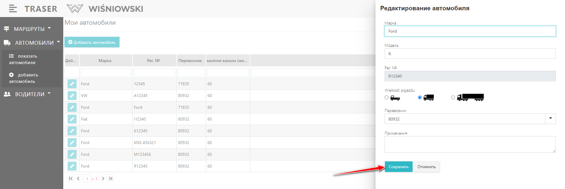 3. Отредактируйте Автомобиль на боковой панели и нажмите кнопку «СОХРАНИТЬ» (Рис. 7.). Регистрационный номер автомобиля не может быть изменен.