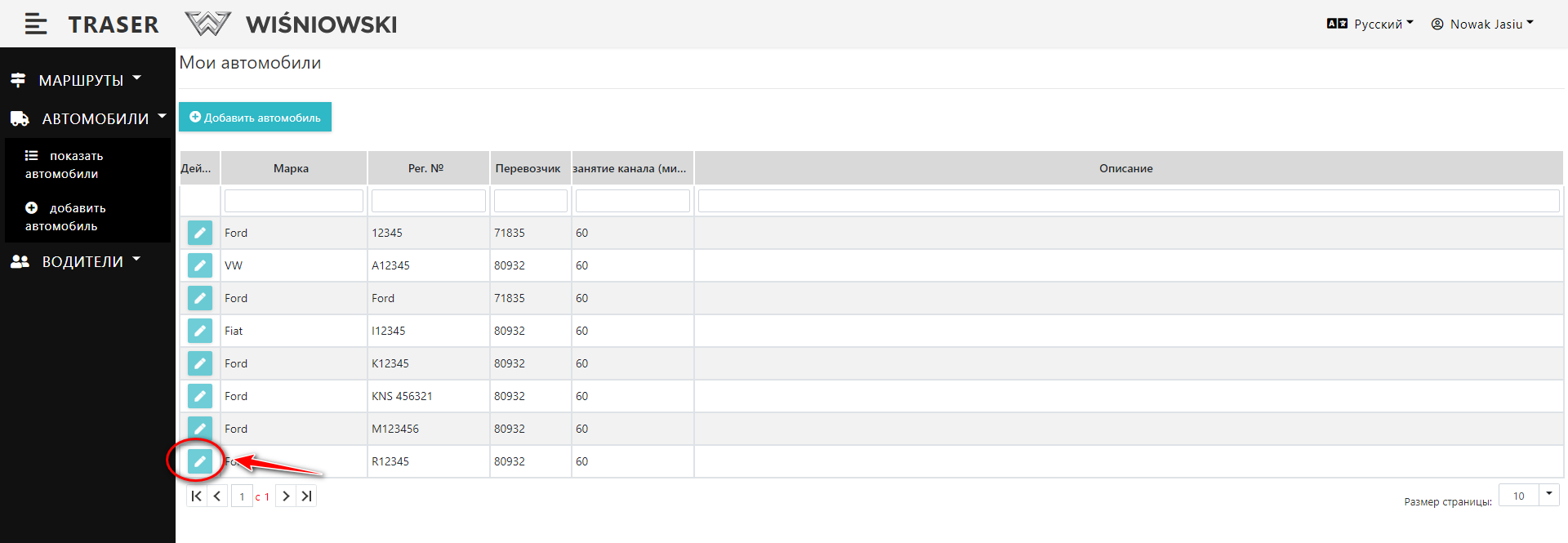 2. Нажмите зеленую кнопку со значком карандаша рядом с соответствующим Автомобилем (Рис. 6.), чтобы открыть боковую панель для редактирования Автомобиля.