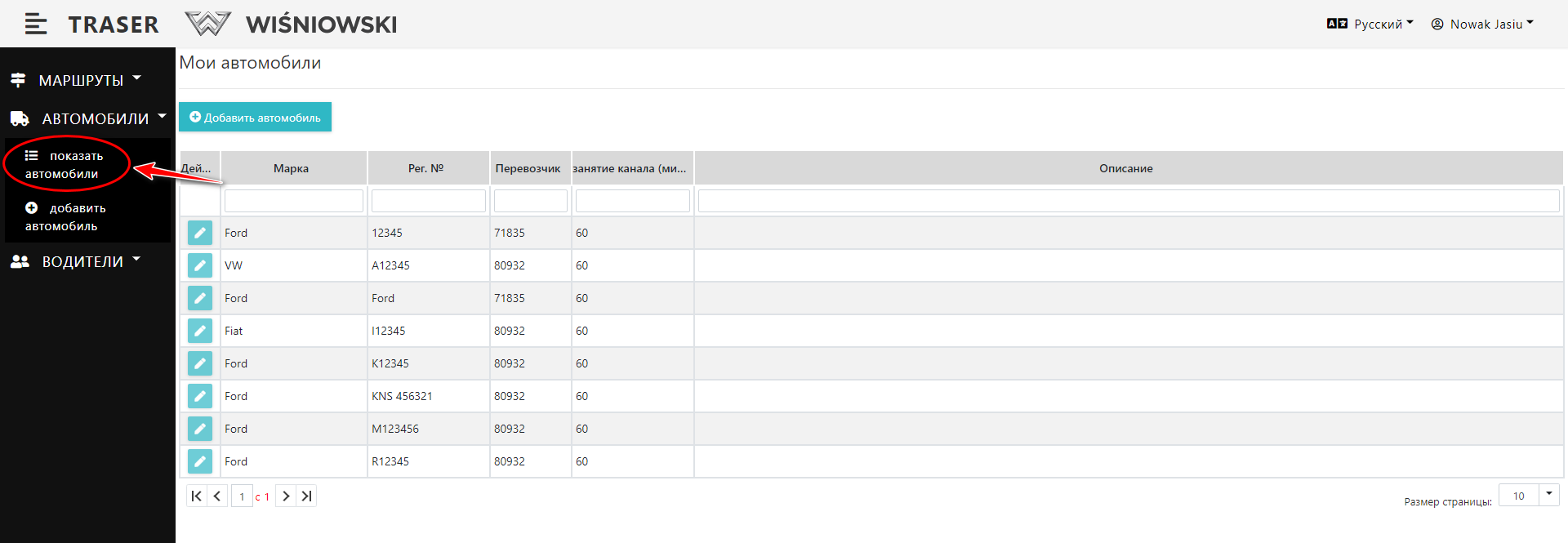 1. Выберите в боковом меню: Автомобили → показать автомобили. (Рис. 5.). Должен появиться список автомобилей.
