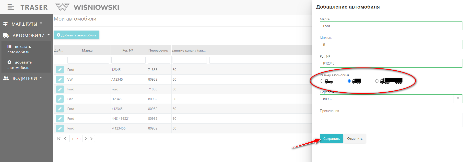 Выделенные красным овалом типы автомобилей определяют их грузоподъемность и время, которое требуется для загрузки в канале. При добавлении автомобиля выберите соответствующий ему тип: