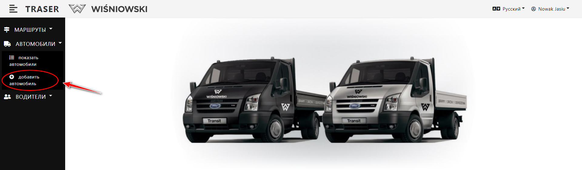 - Выберите в боковом меню: Автомобили → добавить автомобиль (Рис. 1.). Откроется правая боковая панель.