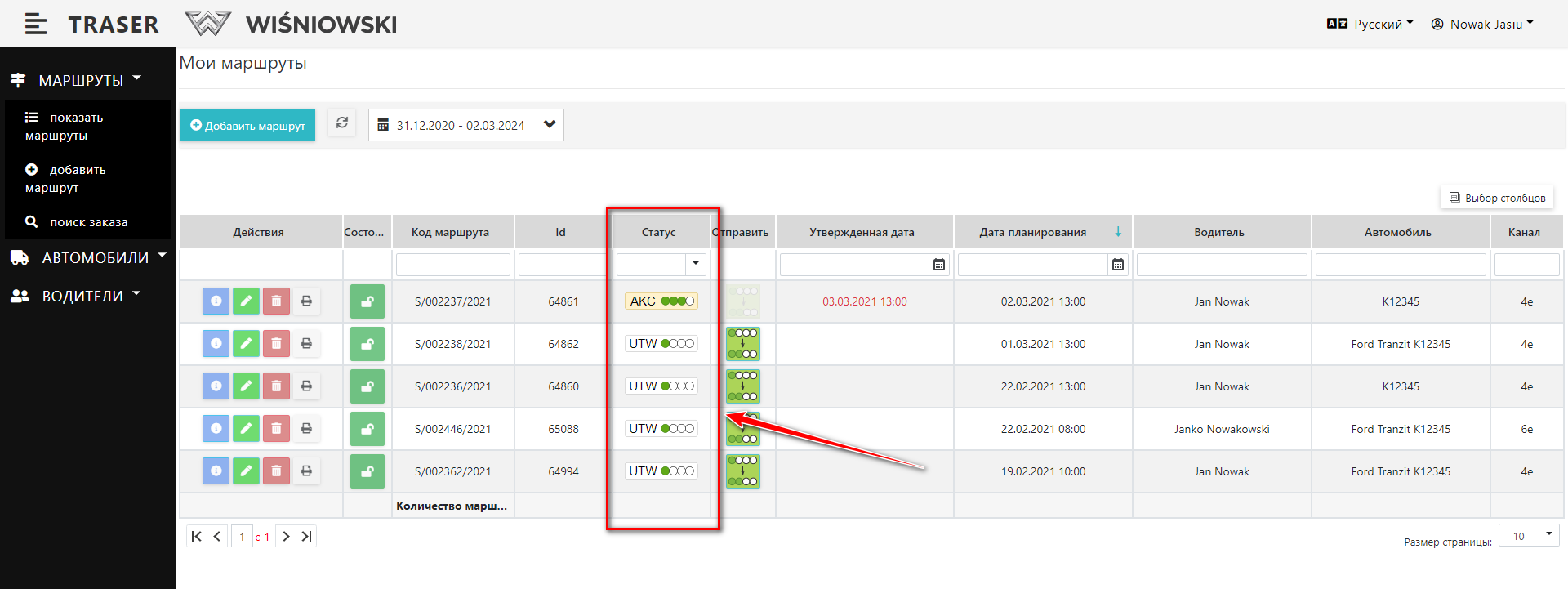 Чтобы перейти от статуса UTW к статусу WER нажмите зеленую кнопку в столбце «Отправить» (Рис. 3.). Эта кнопка активна только для Маршрутов со статусом UTW.