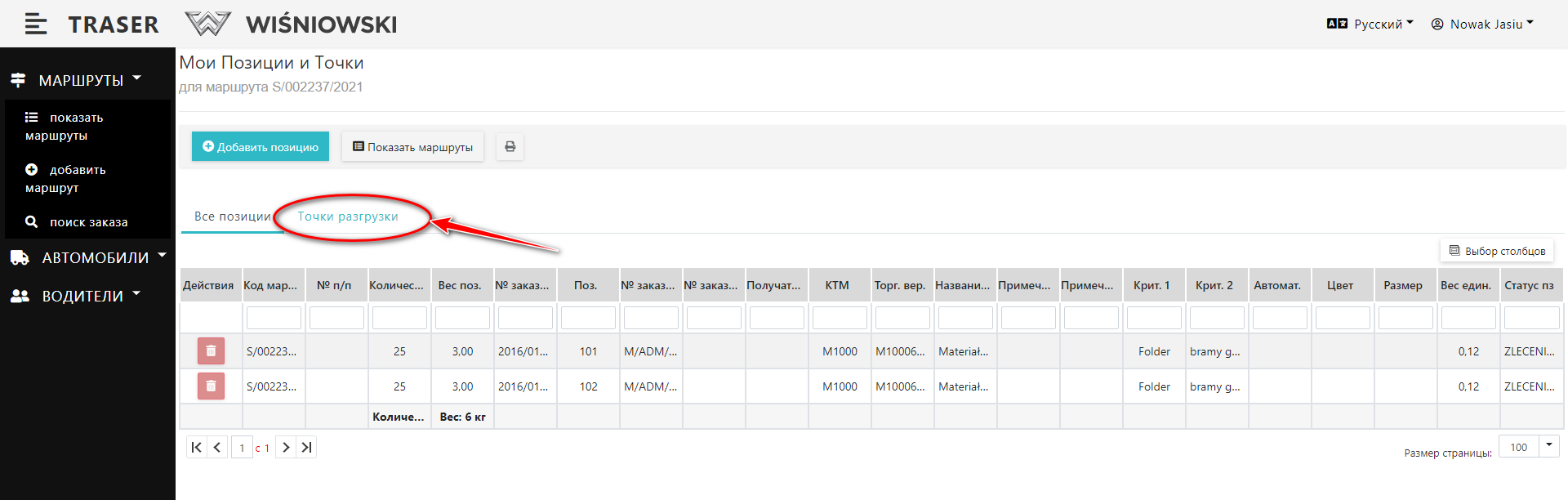 2. Выберите вкладку: Точки разгрузки (Рис. 2.).