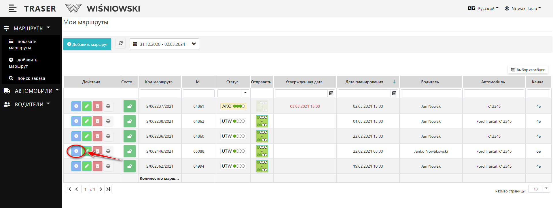 1. Выберите в боковом меню: Маршруты → показать маршруты. Должен отобразиться список маршрутов. Нажмите синюю кнопку со значком информации рядом с соответствующим Маршрутом (Рис. 1.).