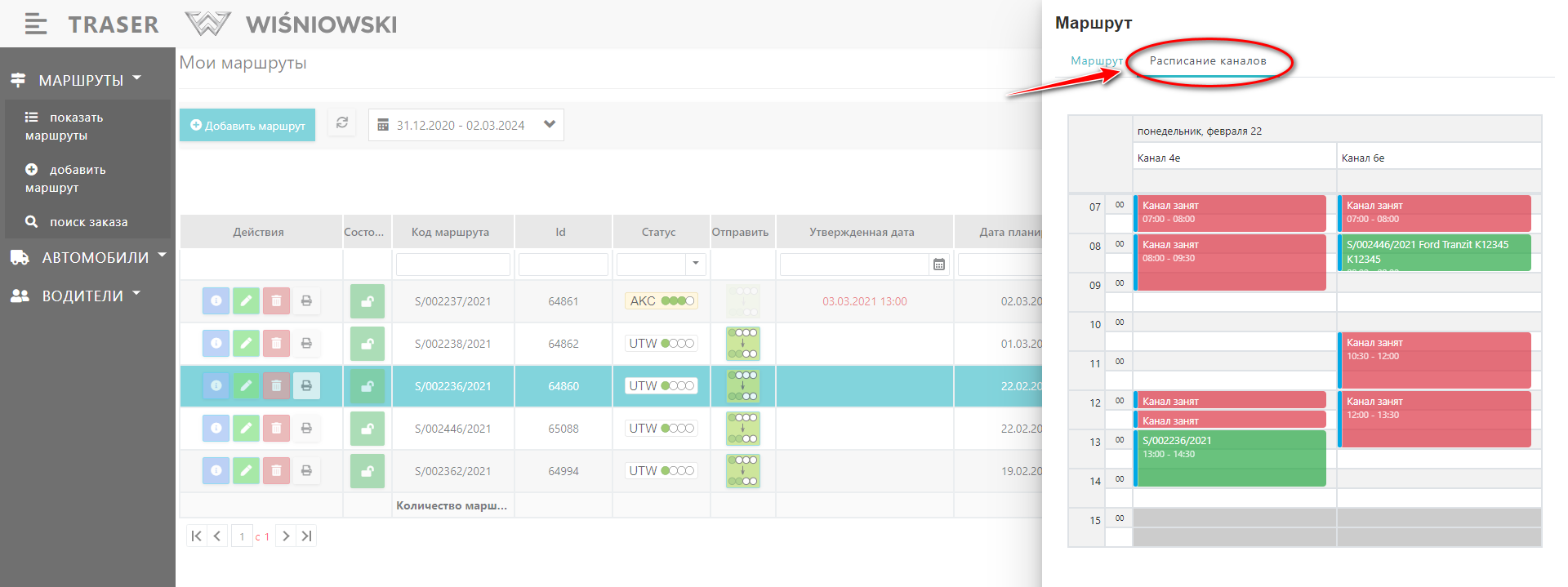 Если вы хотите увидеть занятость Погрузочного дока в графическом виде, выберите вкладку: Расписание каналов (Рис. 3).