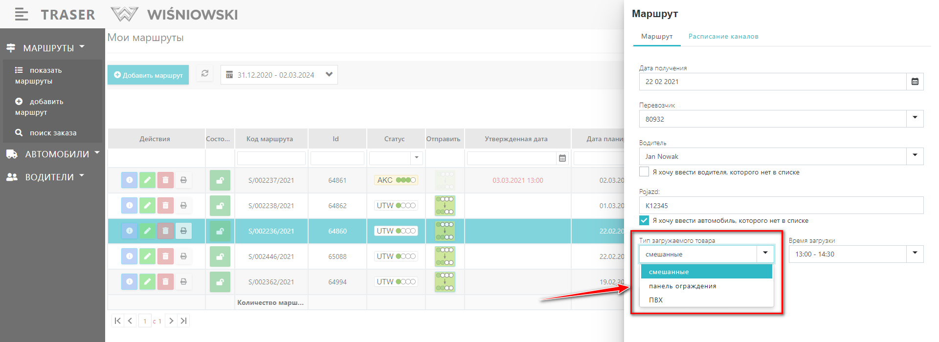 При создании / редактировании Маршрута (см. RU - 02. Создание нового маршрута) вы должны выбрать, какой тип товара вы хотите загрузить (Рис. 1.). На выбор предлагаются следующие типы: