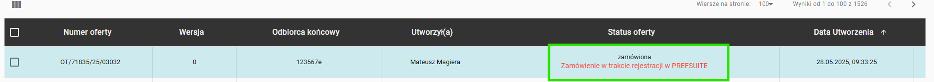 Po wykonaniu kroku generowania zamówienia w zakładce Oferty przy tworzonym uprzednio dokumencie pojawi się status – Zamówienie w trakcie rejestracji w PrefSuite.