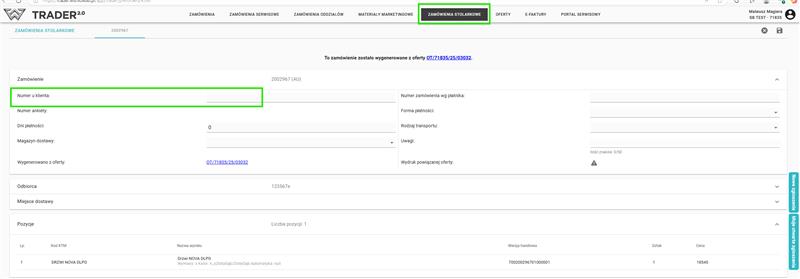 Przed zatwierdzeniem zamówienia możemy uzupełnić kluczowe dla nas informacje takie jak Numer Klienta (będzie on widoczny również na etykiecie transportowej danego wyrobu).
