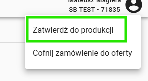 W celu zatwierdzenia zlecenia do produkcji należy przejść do danego zlecenia poprzez kliknięcie jak wcześniej w prawym górnym rogu ikonę trzech kropek. Następnie należy wybrać opcję Zatwierdź do produkcji.