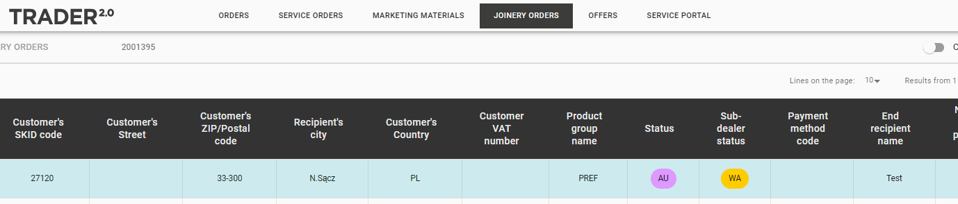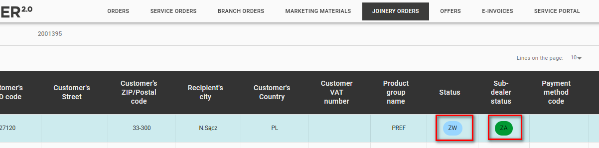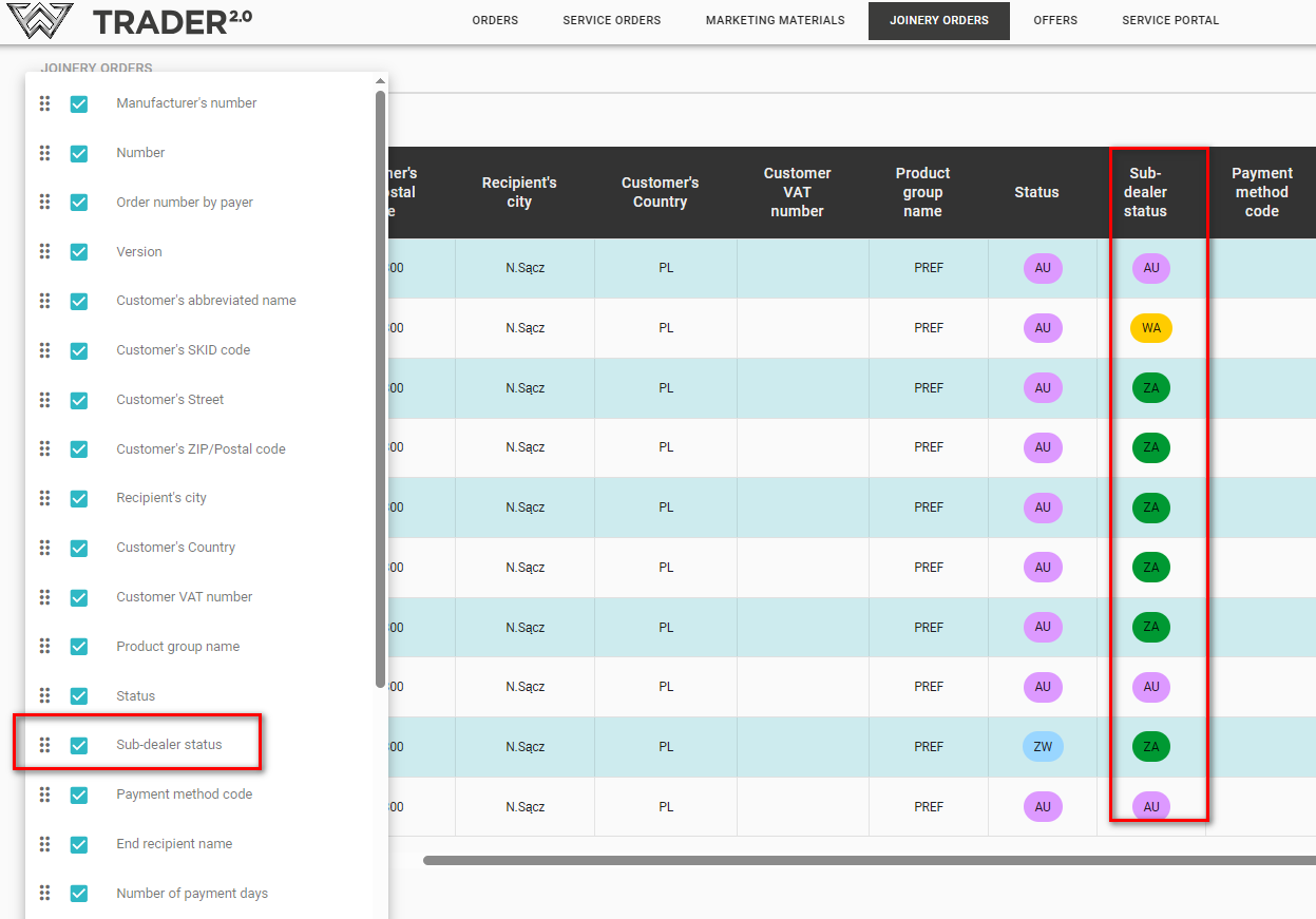 Branch orders under the tab ‘Joinery orders’ are solved differently from standard orders. The key is the new column available on the format ‘SUB-DEALER status’ and the entry in the remarks column (In the remarks field the main dealer always has a hint that the order was generated by a sub-dealer )