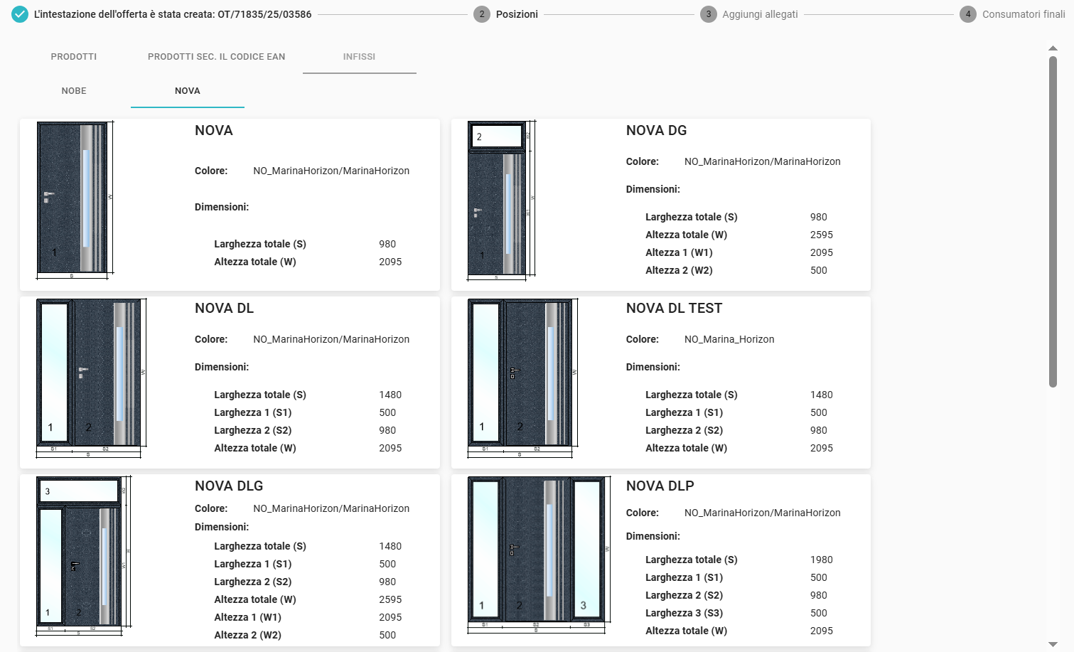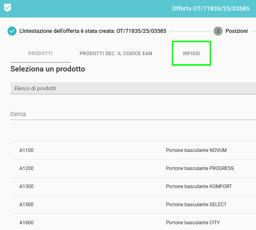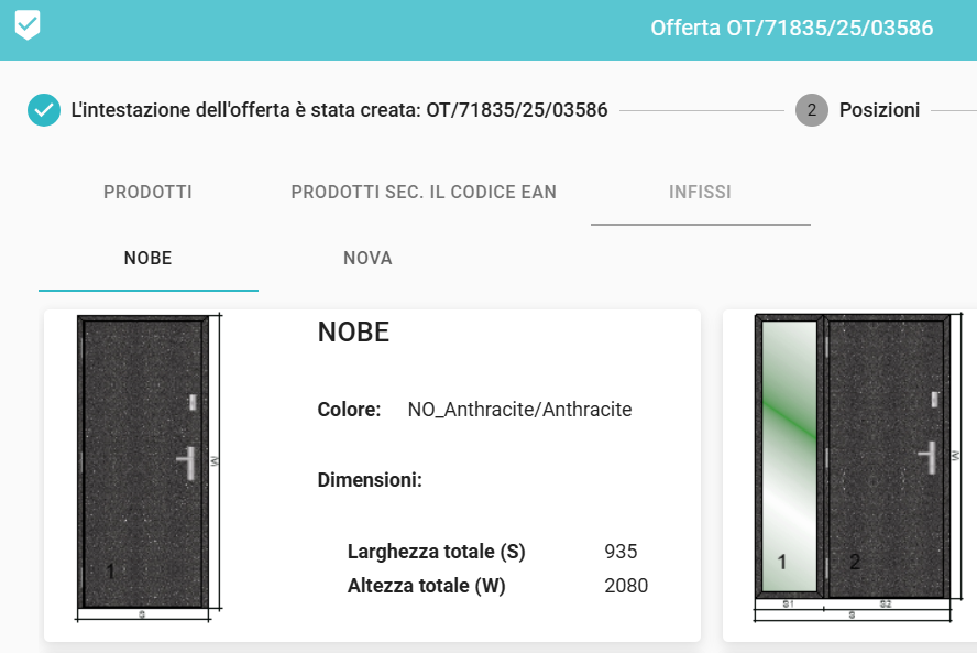 Durante la preparazione di un'offerta nella fase di selezione dei prodotti, si passa alla scheda INFISSI. Si prega di notare, in particolare, che per le quotazioni delle porte NOVA e NOBE dobbiamo sempre iniziare il processo di quotazione creando un'“offerta”. Per motivi tecnici, non è possibile avviare la valutazione con un ordine.