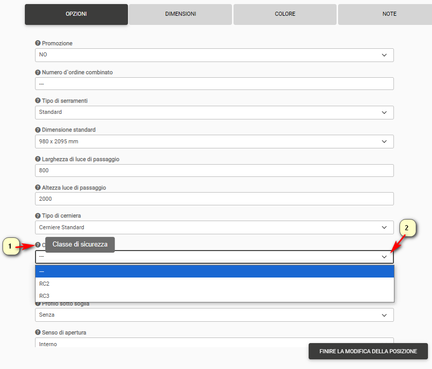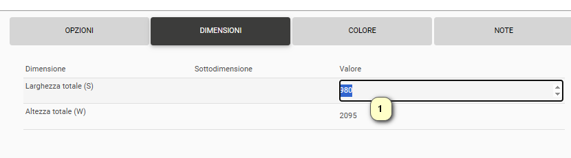 Nella scheda dimensioni, modificare le dimensioni della porta in caso di dimensioni non standard e le dimensioni del sopraluce/fiancoluce. La dimensione standard della porta viene configurata a livello di opzione.