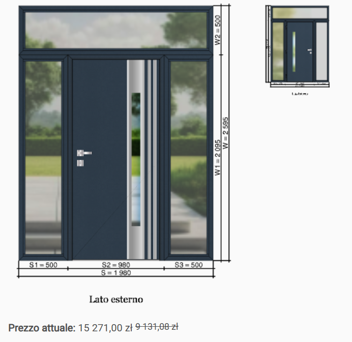 Sul lato sinistro viene visualizzata la porta e il prezzo del prodotto. Si prega di notare che il prezzo viene aggiornato ogni volta che l'opzione (proprietà) viene modificata. Questa funzionalità consente di verificare facilmente la differenza di prezzo quando si cambiano i singoli elementi dell'attrezzatura.