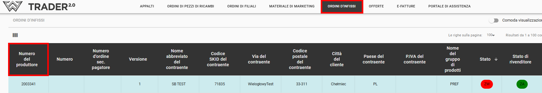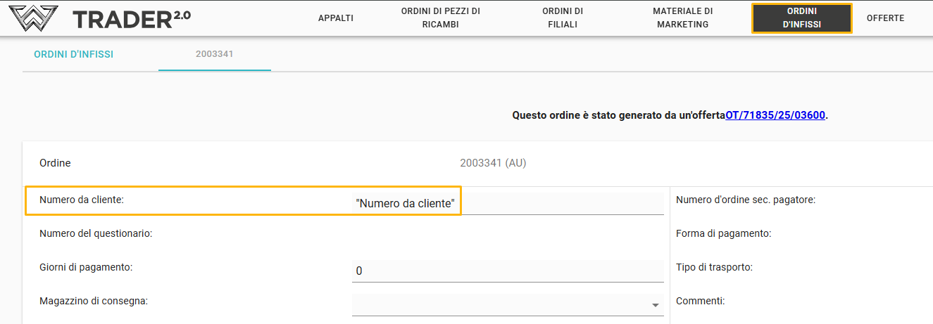 - Colore rosso – il numero d'ordine di Trader2.0 corrispondente al numero presente nella scheda “Ordini d'Infissi” nella colonna “Numero del produttore”