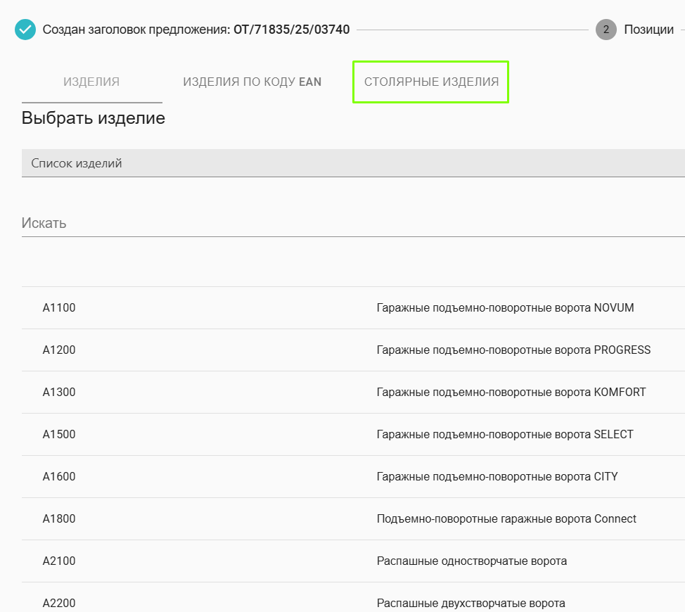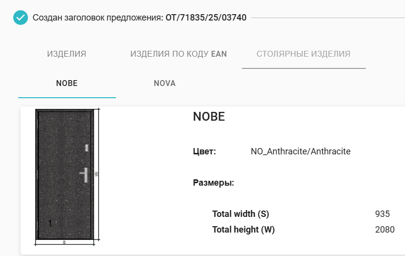 При формировании предложения на этапе выбора продукта перейдите на закладку СТОЛЯРНЫЕ ИЗДЕЛИЯ. Обратите особое внимание на то, что при подготовке предложения на двери NOVA и NOBE вы всегда должны начинать этот процесс с создания „предложения”. По техническим причинам невозможно начать расчет предложения с заказа.