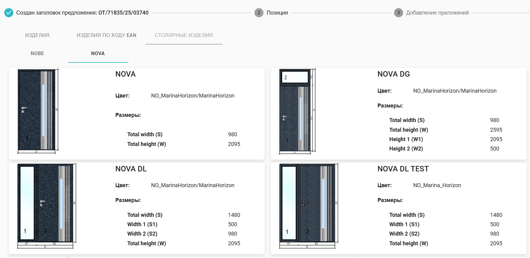 После выбора закладки столярных изделий в строке ниже появляется разделение на двери NOBE и двери NOVA.