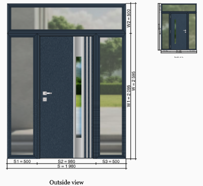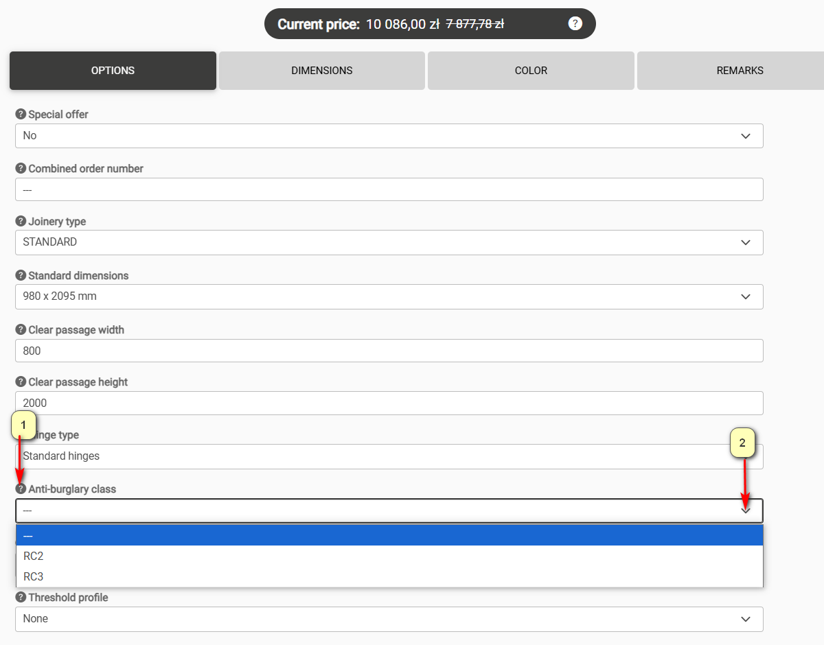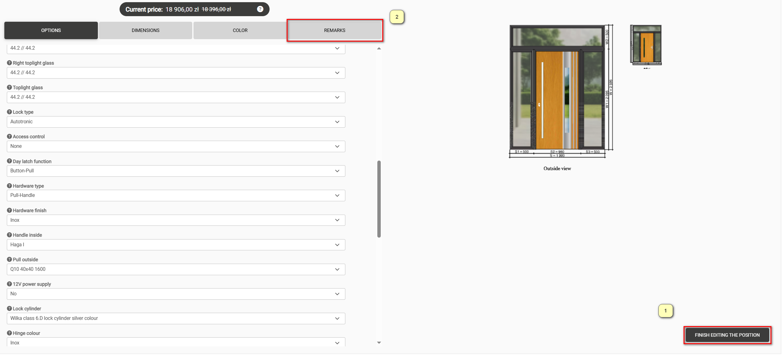 С левой стороны отображается визуализация двери и цена изделия. Обратите внимание, что цена обновляется при каждом изменении опций (свойств). Эта функция позволяет легко проверить разницу в цене при изменении отдельных элементов оборудования.