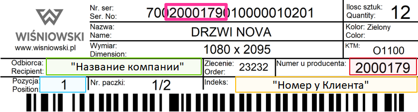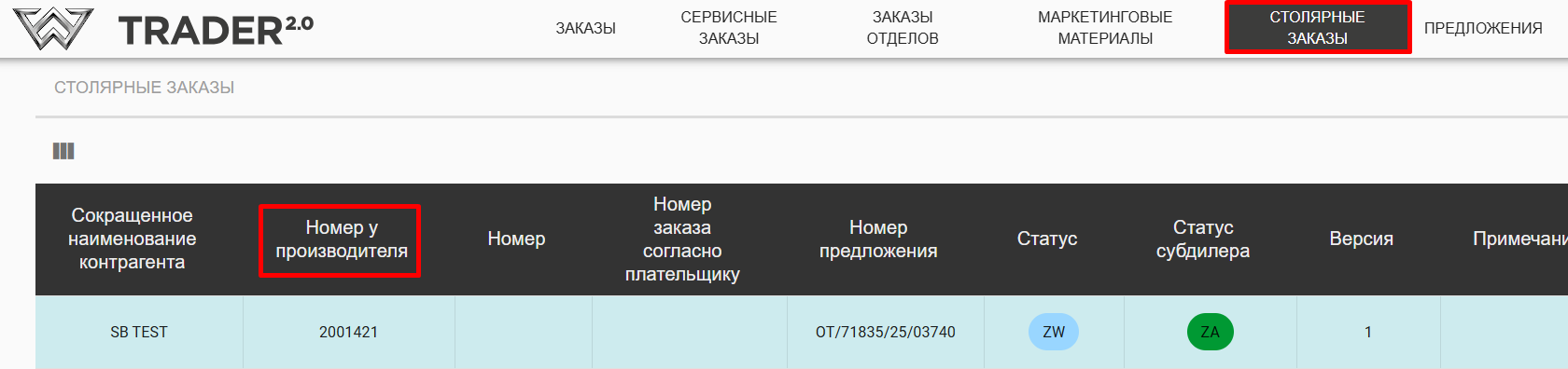 - Красным цветом – номер заказа Trader2.0 соответствующий номеру из закладки „Заказы на столярные изделия” в колонке „Номер производителя”.