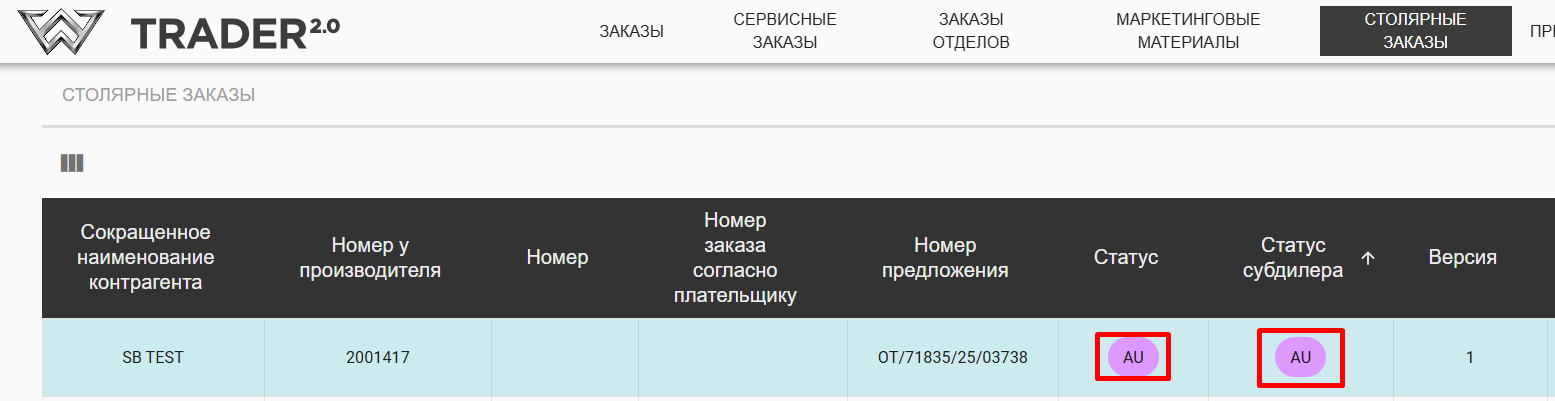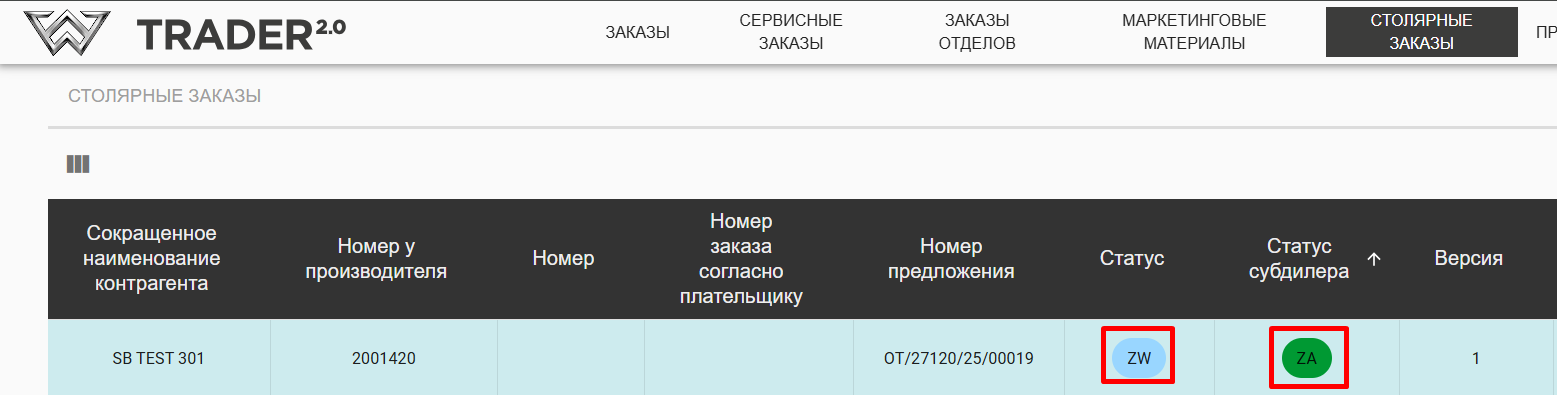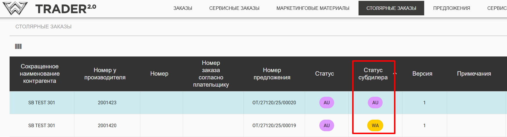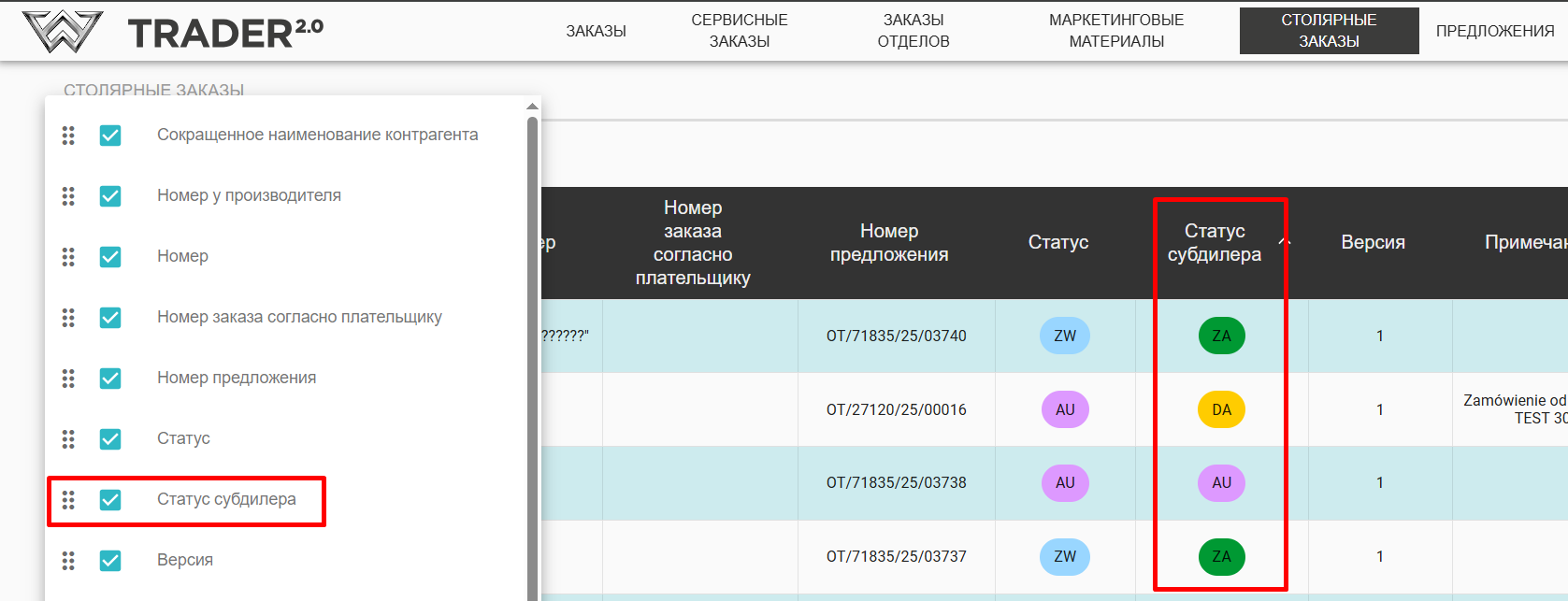 На закладке „Заказы на Столярные изделия” появится новый заказ от вашего субдилера - такой заказ можно определить по полю „Примечания” и полю „Статус” – „Субдилер” = DA (Для Принятия)