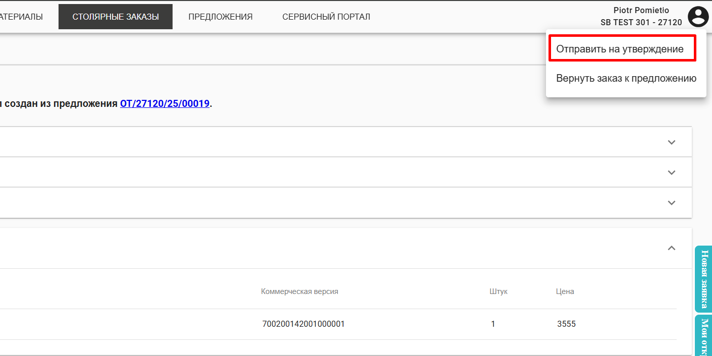 1) После создания предложения в соответствии с рекомендациями из пункта I, перейдите на закладку „Заказы столярных изделий” и вы увидите следующие действия по заказу, который Вас интересует