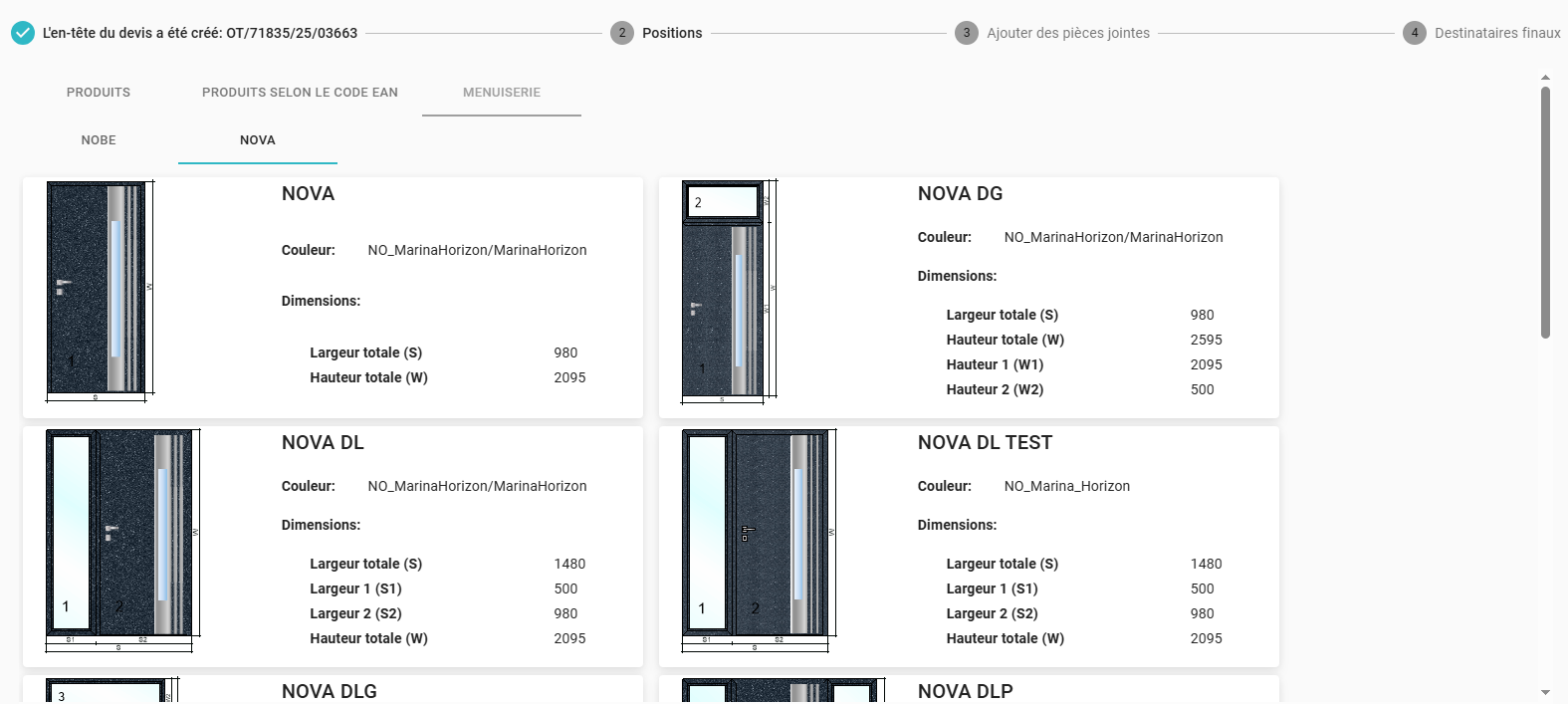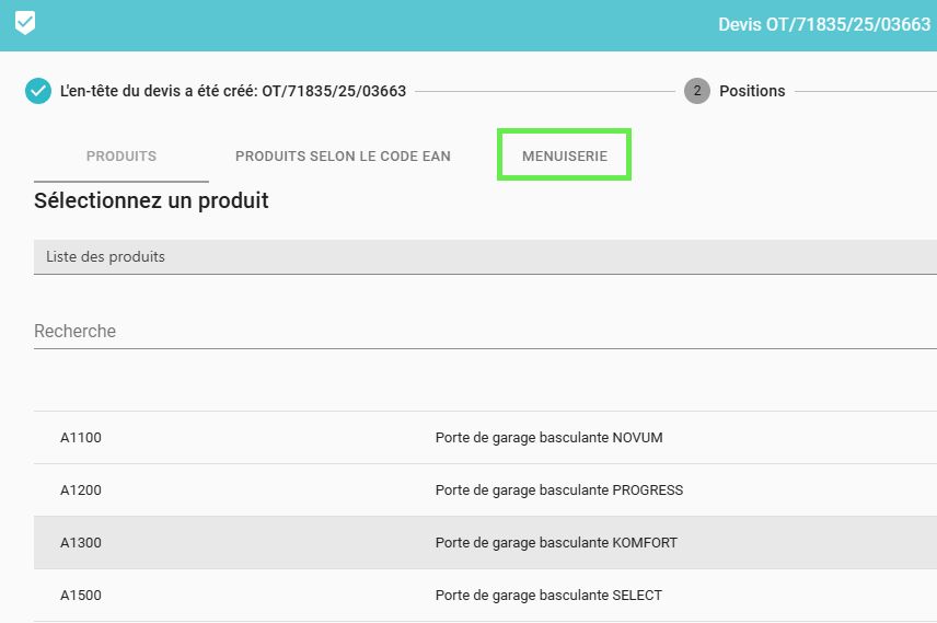 Lors de la préparation du devis à l'étape de la sélection des produits, il faut passer à l'onglet MENUISERIE. Veuillez noter en particulier que dans le cas du devis des portes NOVA et NOBE, il faut toujours commencer le processus de devis par la création d'un « devs ». Pour des raisons techniques, il n'est pas possible de commencer le devis par une commande.