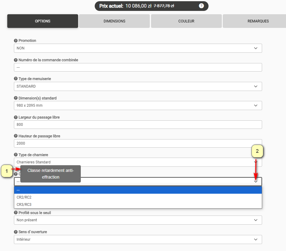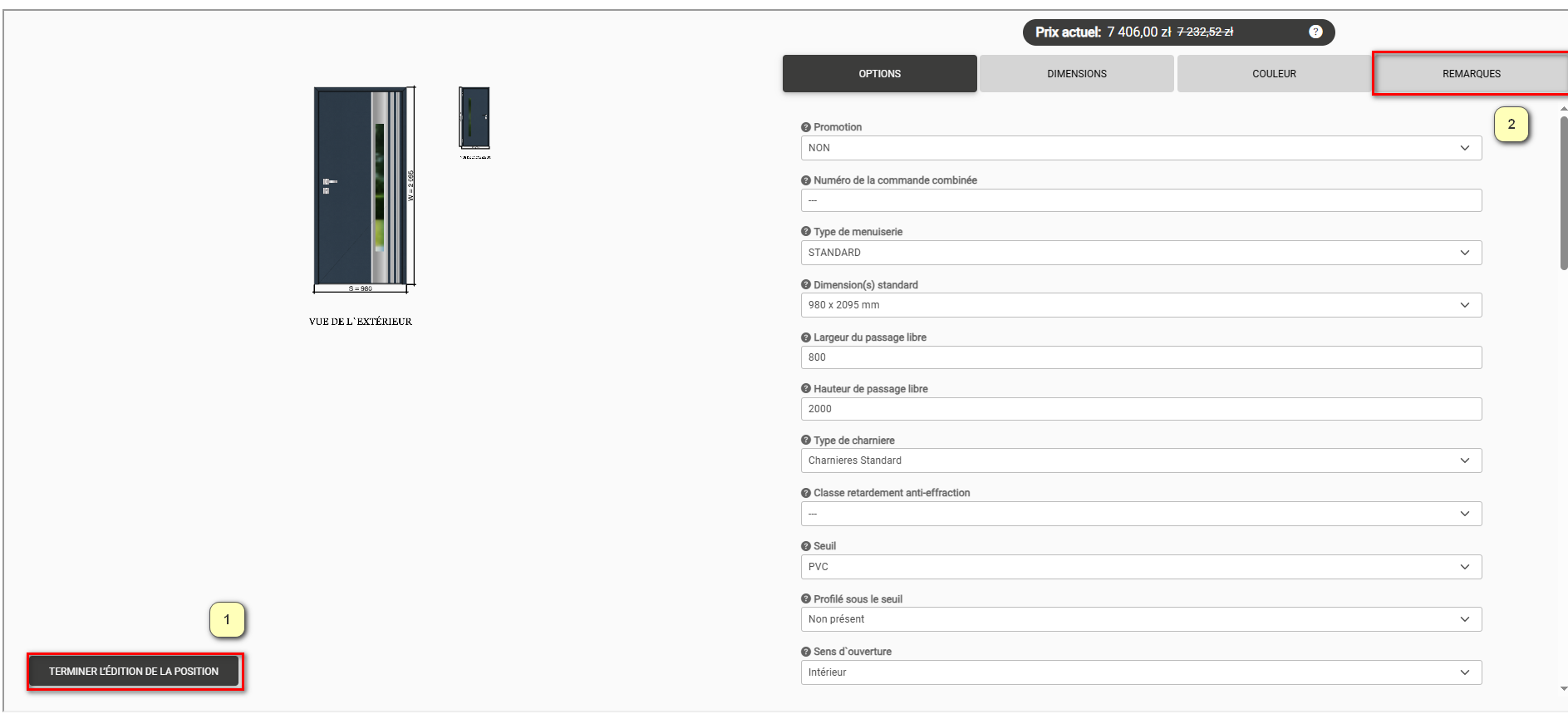 Sur le côté gauche, vous trouverez un aperçu de la porte et le prix du produit. Veuillez noter que le prix est mis à jour chaque fois que l'option (propriétés) est modifiée. Cette fonctionnalité permet de vérifier facilement la différence de prix lors d'un changement d'équipement.