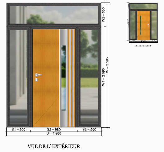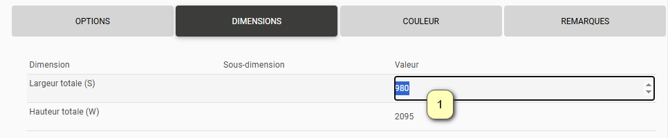 Dans l'onglet dimensions, il faut modifier la dimension de la porte dans le cas de dimensions non standard et les dimensions de l'imposte/partie(s) fixe(s). Les dimensions standard de la porte sont configurées au niveau des options.