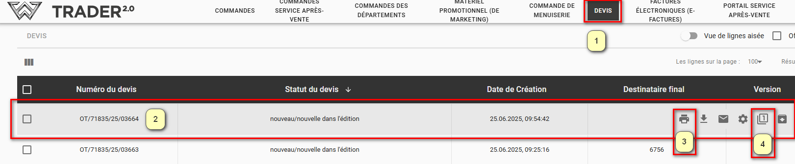 Les fonctionnalités telles que Cloner la position du devis, Cloner le devis fonctionnent par analogie avec la méthode standard du devis.