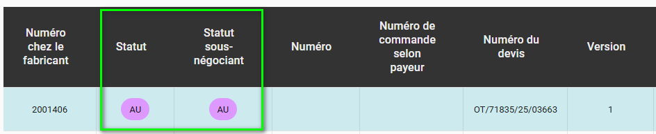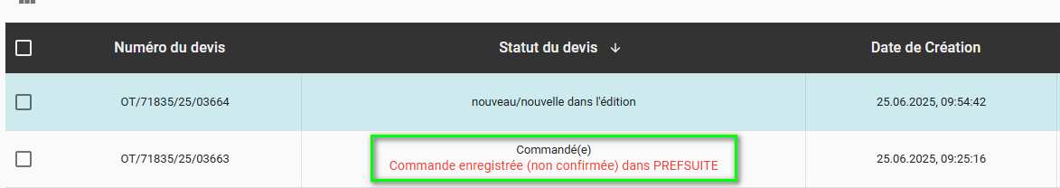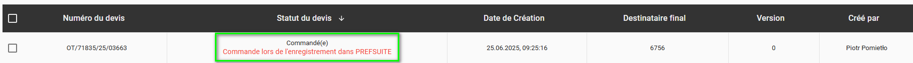 Après l'étape de génération de la commande, le statut apparaîtra dans l'onglet DEVIS à côté du document précédemment créé. – Commande lors de l’enregistrement dans PREFSUITE.