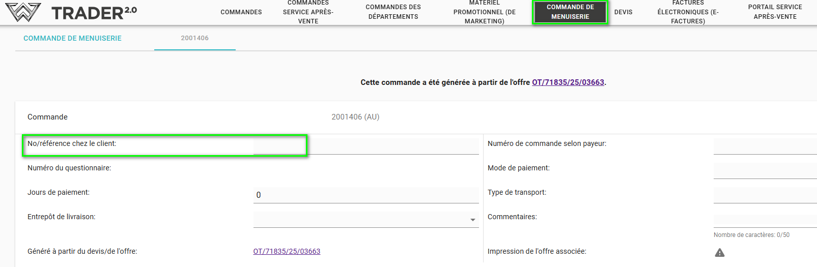 Au moment où une commande a reçu le statut d'enregistrée (non confirmée) dans PrefSuite, elle peut être trouvée dans l'onglet COMMANDES DE MENUISERIE.