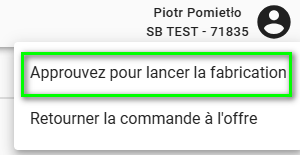 Pour approuver la commande pour la fabrication, il faut naviguer jusqu'à la commande en question en cliquant sur l'icône des trois points dans le coin supérieur droit, comme précédemment. Ensuite, il faut sélectionner l’option Approuvez pour lancer la fabrication.