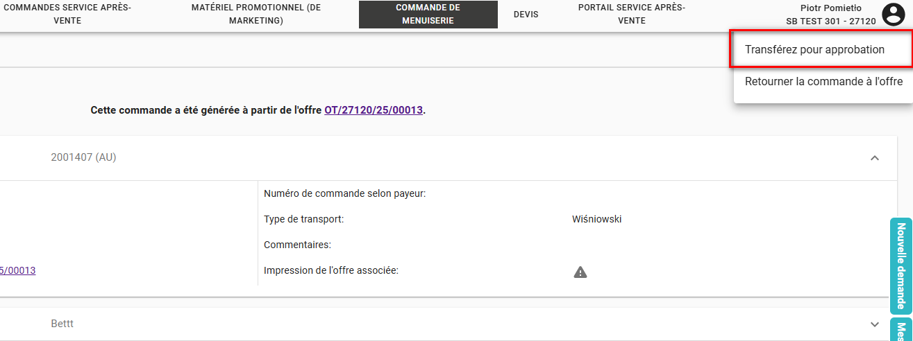 1) Après avoir créé une offre conformément aux lignes directrices du point I, nous allons dans l'onglet « commandes de menuiserie » et nous verrons les actions suivantes sur la commande qui nous intéresse